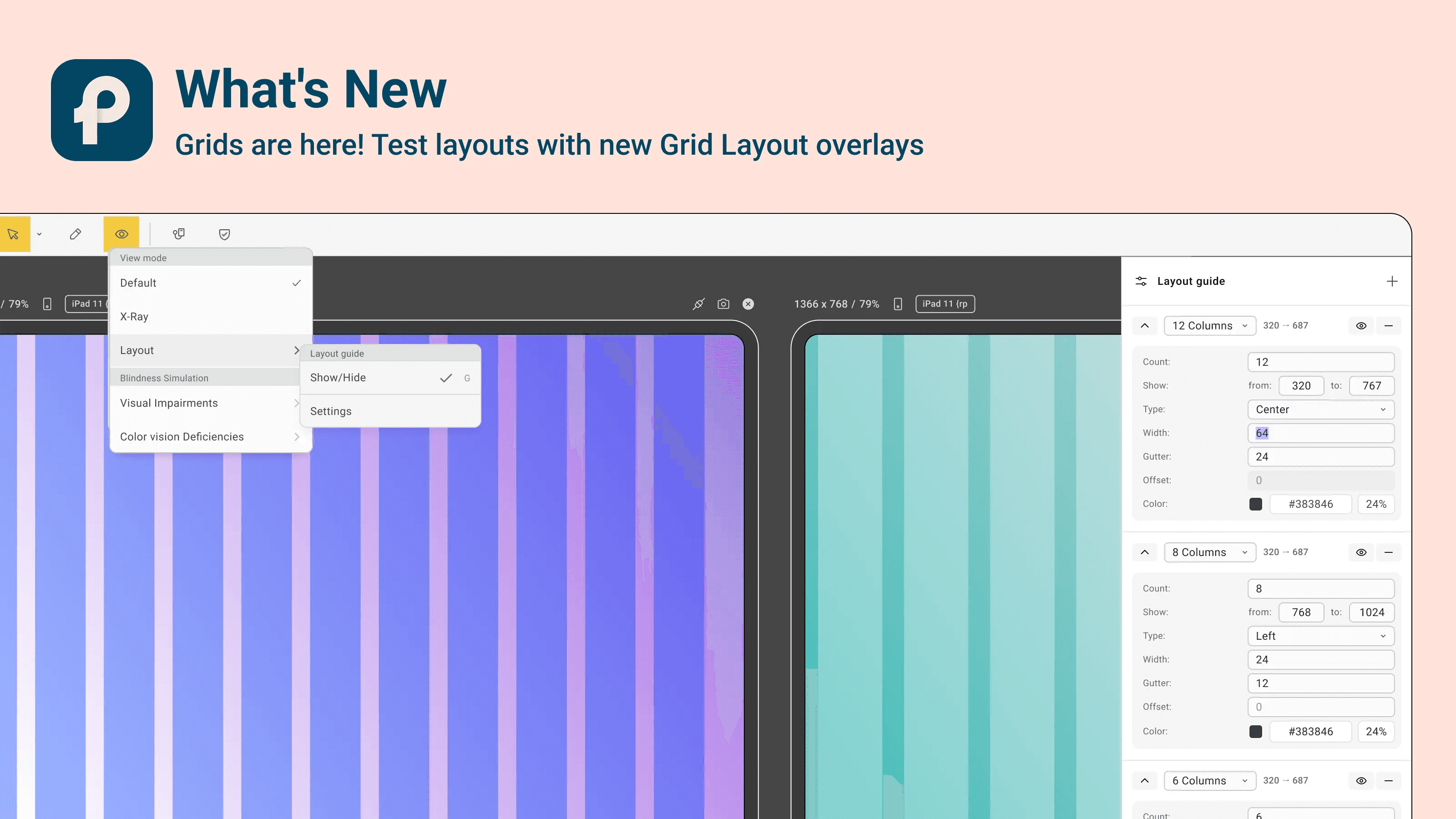 Grid Layout → Overlay customizable grids to check alignment and spacing across breakpoints. Perfect for pixel-perfect layouts.