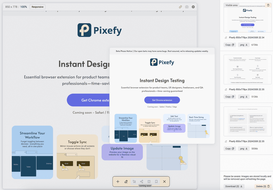 We're excited to unveil our new visible area screenshot feature, and we plan to expand this with selection and full page screenshots in the future. Plus, you can now take multiple screenshots, preview them, and download them all with just one click.